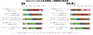 人間関係における調査の中で、家族と親密なコミュニケーションをとれる人は家族との関係に8点以上(満点は10点)の満足度を持っている人は47.7%存在します。また地域隣人との関係については、地域隣人とのコミュニケーションをとる人達の母数が元々非常に少数ではありますが、親密なコミュニケーションをとれる人は地域との関係に9点以上の満足度を感じている人は60.5%います。また「どちらかというと親密なコミュニケーションをとれる人」は8点以上の満足度を感じている人は50.3%います。このことは、家族だけでなく地域隣人とのゆるやかで、比較的親密なコミュニケーションが幸福度に影響を与えることを示しています。