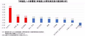 「どの分野が幸福度を左右しているか」を解析したところ、「生きがい・未来への希望」「所得・富」「交友関係・人間関係」の順で幸福度への影響が大きかった。「仕事(ワークライフバランスを含む)」 「コミュニティとのつながり・社会貢献」は統計的に有意ではなかった。と記載があります。